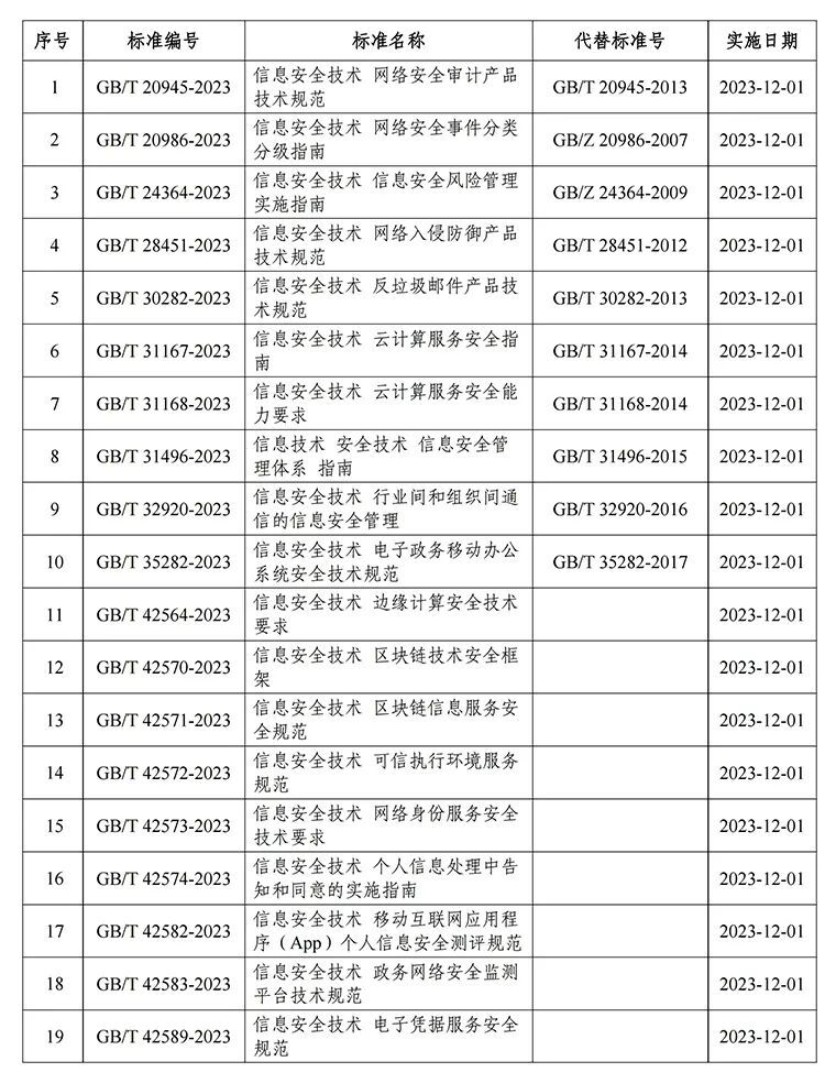 根据2023年5月23日国家市场监督管理总局、国家标准化管理委员会发布的中华人民共和国国家标准公告(2023年第2号),全国信息安全标准化技术委员会归口的19项网络安全国家标准正式发布。具体清单如下: