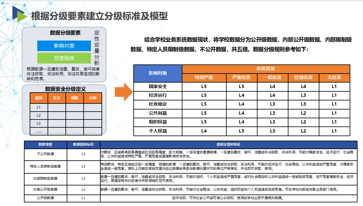在教育数据分类的基础上,根据教育数据在经济社会发展中的重要程度,以及一旦遭到泄露、篡改、破坏或者非法获取、非法利用,对国家安全、经济运行、社会秩序、公共利益及个人、组织合法权益造成的危害程度,可将教育数据分为公开级数据、内部公开级数据、内部限制级数据、特定人员限制级数据、不公开数据,共五级。